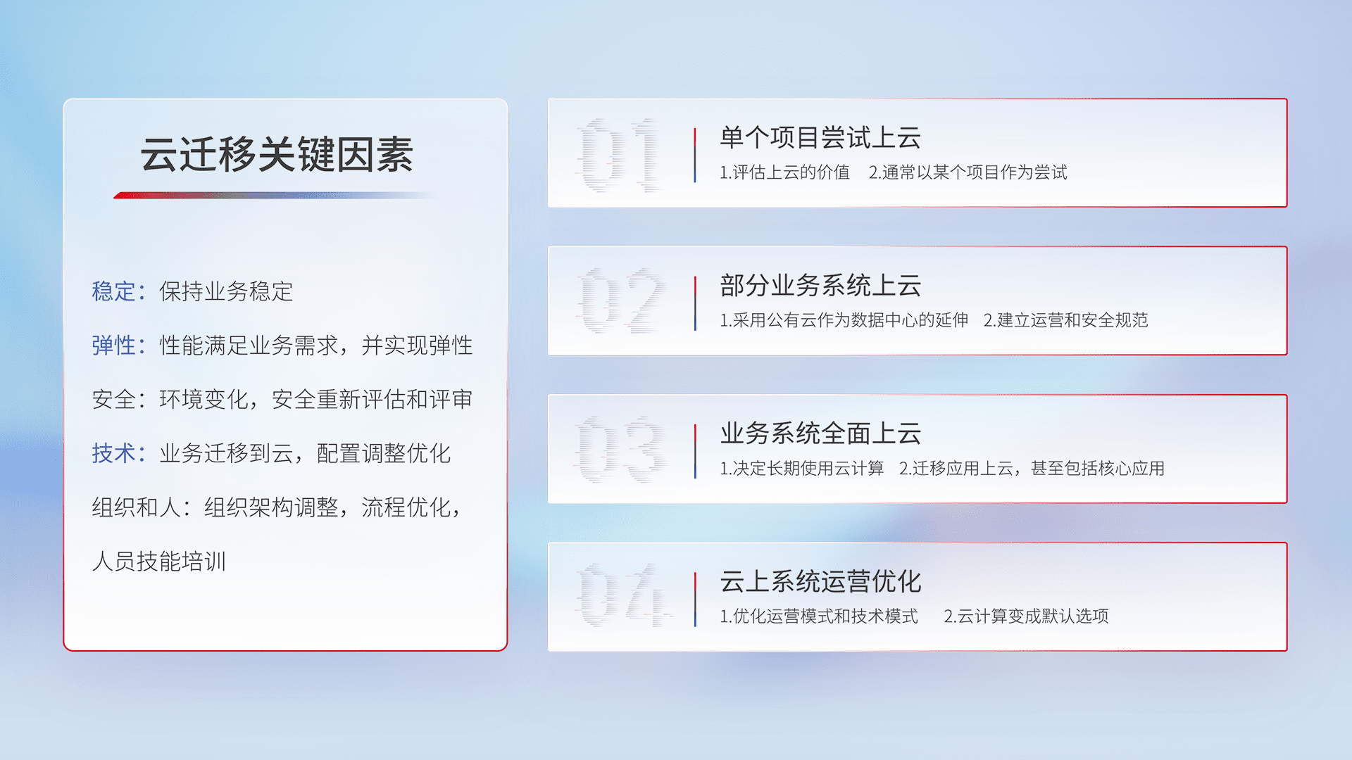 结合实际业务,,,从规划设计、、、、云平台选型、、、、云原生改造、、、数据迁移、、集成交付,,,,迁移全过程为客户识别最佳上云路径,,,,做好风险识别管理,,,,设计网络架构、、、身份权限、、、、安全审计合规、、、操作审计、、、日志审计、、、、监控告警策略、、多站点容灾设计等,,对云上基础设施进行整体规划,,提升IT治理水平,,以满足弹性、、、、高可用、、、、高性能的需求。。。