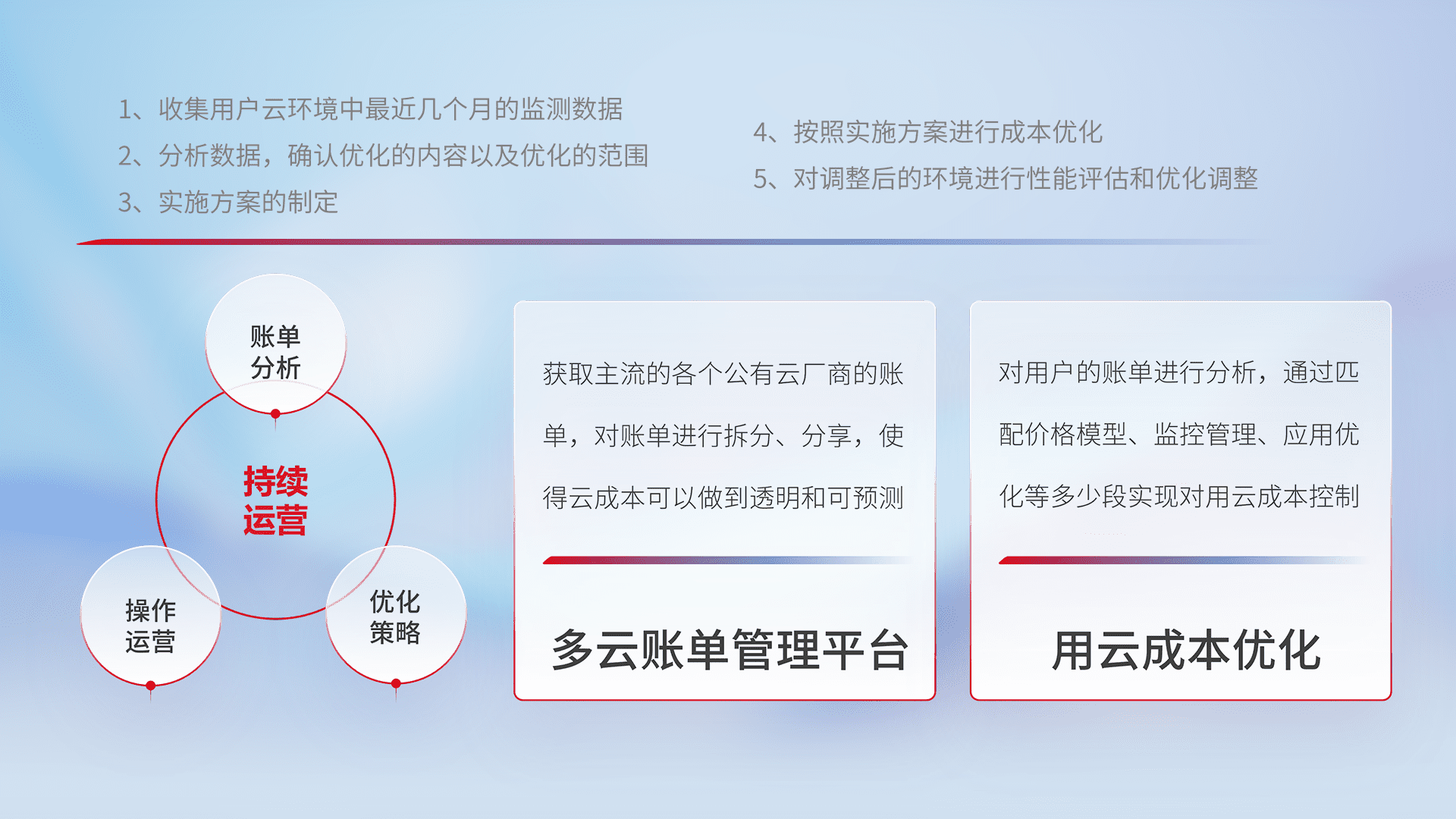 通过多云纳管,,以统一的资源数据模型把客户的云资源进行抽象和封装,,,,进而实现对多云资源的统一操作,,,保障云资源管理的可靠性、、稳定性与可用性。。。量身定制化运维内容,,,配置、、开发运维、、、、补丁管理、、、、备份、、、、监控、、、认证和访问管理、、审计和日常巡检等,,,,保障在用云过程中的可靠度,,,稳定度以及高可用率。。。